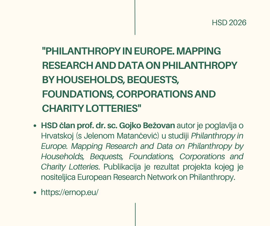 Philanthropy in Europe. Mapping Research and Data on Philanthropy by Households, Bequests, Foundations, Corporations and Charity Lotteries Član HSD-a prof. dr. sc. Gojko Bežovan autor je poglavlja o Hrvatskoj (s Jelenom Matančević) u studiji Philanthropy in Europe. Pročitajte više