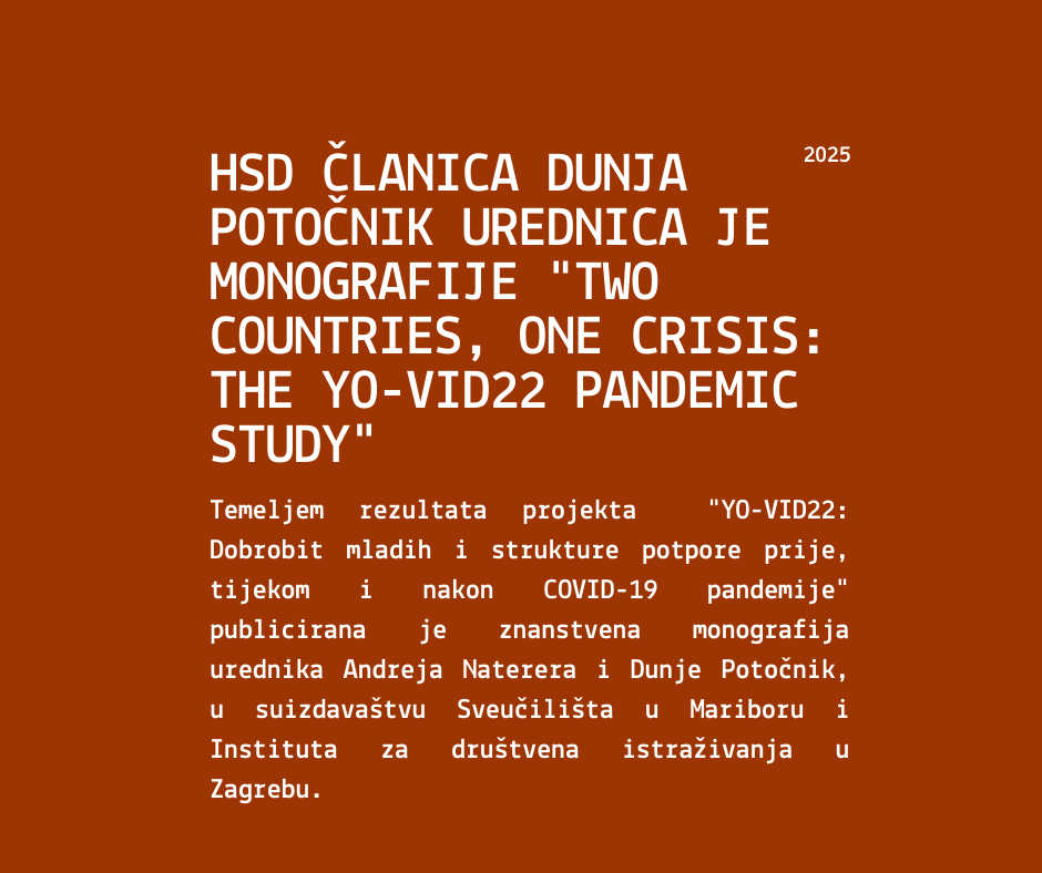 HSD članica Dunja Potočnik urednica je znanstvene monografije Two Countries, One Crisis: The YO-VID22 Pandemic Study, zajedno s Andrejem Natererom, nastale temeljem rezultata projekta “YO-VID22: Dobrobit mladih i strukture potpore prije, tijekom i nakon COVID-19 pandemije”.