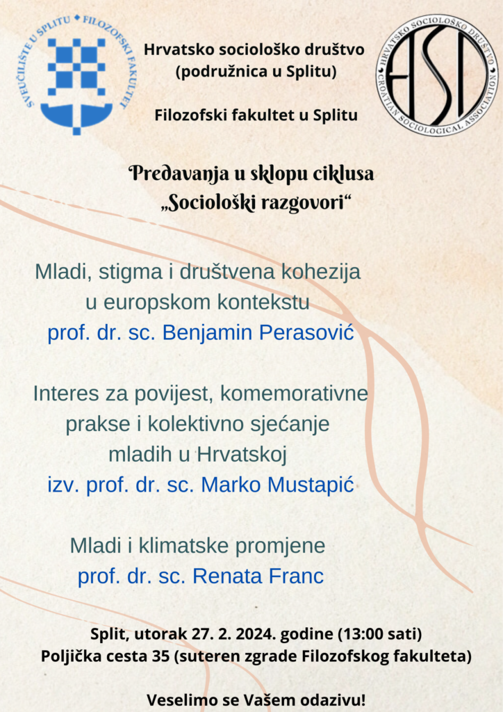 U okviru ciklusa ‘Sociološki razgovori‘, splitska podružnica Hrvatskog sociološkog društva i Filozofski fakultet u Splitu predstavljaju tri izlaganja koja istražuju različite aspekte života mladih danas. Izlaganja: 1. Mladi, stigma i društvena kohezija u europskom kontekstu – prof. dr. sc. Benjamin Perasović 2. Interes za povijest, komemorativne prakse i kolektivno sjećanje mladih u Hrvatskoj – izv. …