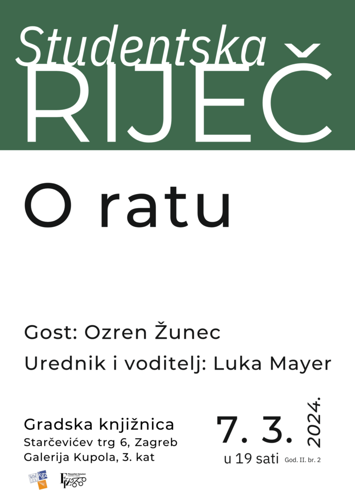 Obavještavamo vas da je tribina Studentska riječ: O ratu, koja se trebala održati 7. ožujka 2024. u Gradskoj knjižnici, nažalost odgođena zbog bolesti sudionika. Novi termin bit će objavljen naknadno. O ratu Povratak rata u Europu nakon desetljeća mira, trenutna kriza na Bliskom istoku, tenzije oko Tajvana, sveprisutna prijetnja nuklearnog sukoba i druga nedavna događanja dovela su do …