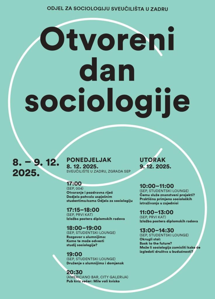 Odjel za sociologiju poziva sve sadašnje i bivše studente/ice i sve zainteresirane da nam se pridruže u dijalogu o suvremenim društvenim temama i neformalnom druženju. Program, u ponedjeljak 8. prosinca, započinje u 17 sati u predavaonici SEP-004 dodjelom pohvala uspješnim studentima i studenticama sociologije te izlaganjem postera najbolje ocijenjenih diplomskih radova. U ponedjeljak će se …